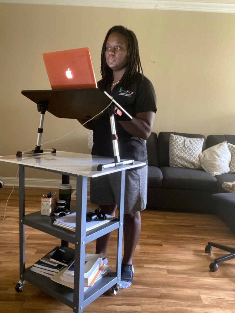 It’s a whole entire different perspective. You can see the comfort of my existence working from home. You can see the mess underneath my computer as I try to keep all of the things that I need close by for quick references. But it’s all in how I see things. I look at the headshot of me and see the put together face of a faculty member who is just trying to deliver course content to her students. In contrast to the hard working faculty member who is trying to multitask from a makeshift mobile cart while standing because she’s been working from a seat position for too long and it’s starting to impact her alignment. I can choose to dwell on the lack of a second office, the lack of a second desk, the lack of one of those nice, expensive mobile standing desks, or the need to have a massager, hair scrunchie, and headphones right beside class notes and textbooks. But I choose to live in the headshot perspective where everything looks IS put together and in order. Where there is joy in my work and no pain in my back or legs. Where I am 100% prepared for what this day of virtual work has to throw at me.